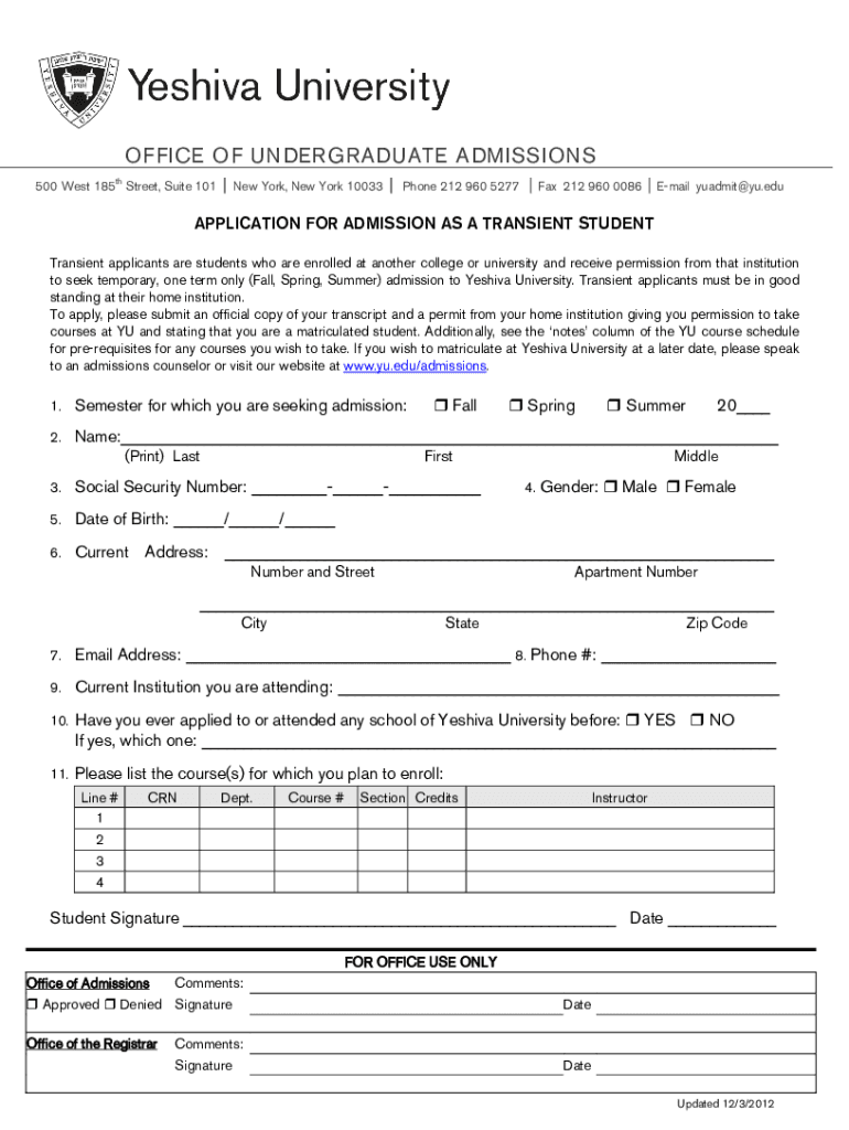 OFFICE OF UNDERGRADUATE ADMISSIONS th500 West 185 Street, Suite 101New York, New York 10033Phone 212 960 5277Fax 212 960 0086Email yuadmit@yu.eduAPPLICATION FOR ADMISSION AS A TRANSIENT STUDENT Transient