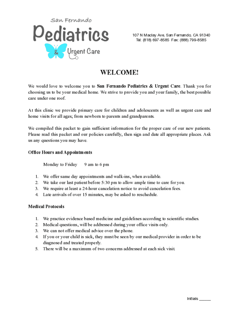 107 N Malay Ave, San Fernando, CA 91340Tel: (818) 6978585 Fax: (888) 7998585WELCOME! We would love to welcome you to San Fernando Pediatrics & Urgent Care. Thank you for choosing us to be your medical