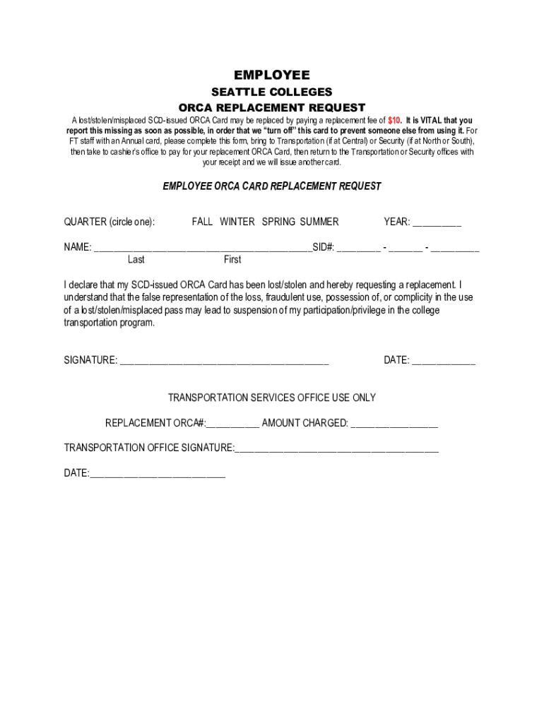 EMPLOYEE SEATTLE COLLEGES ORCA REPLACEMENT REQUEST A lost/stolen/misplaced SCD issued ORCA Card may be replaced by paying a replacement fee of $10. It is VITAL that you report this missing as soon