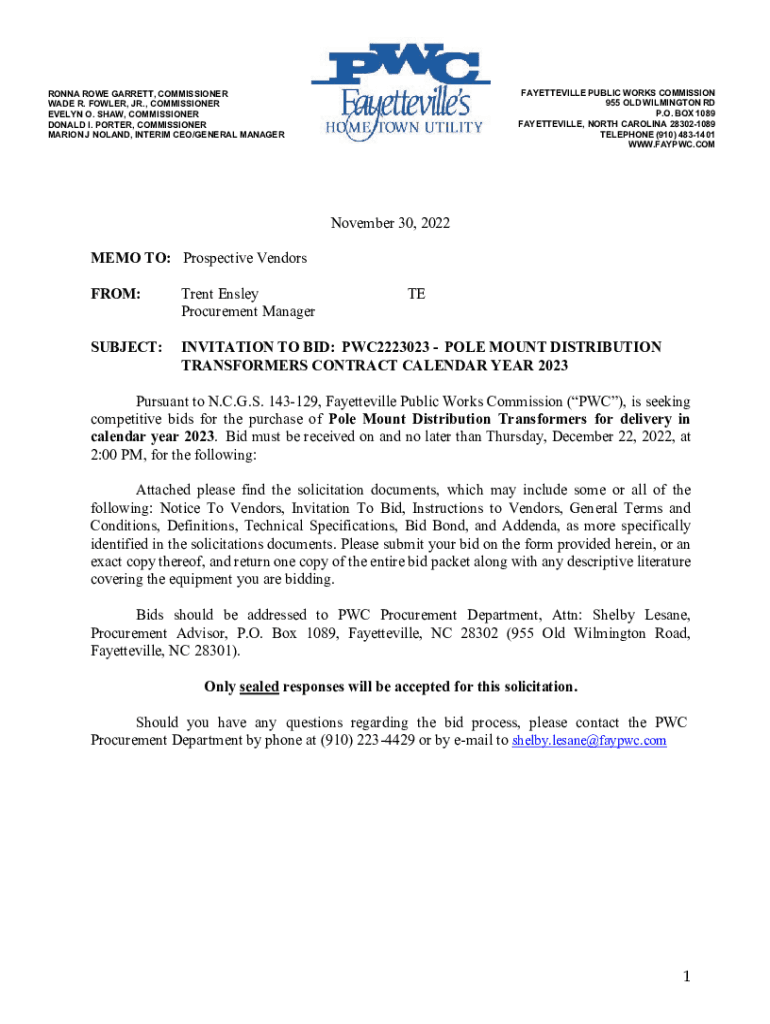 FAYETTEVILLE PUBLIC WORKS COMMISSION 955 OLD WILMINGTON RD P.O. BOX 1089 FAYETTEVILLE, NORTH CAROLINA 283021089 TELEPHONE (910) 4831401 WWW.FABRIC.CORONA ROWE GARRETT, COMMISSIONER WADE R. FOWLER,