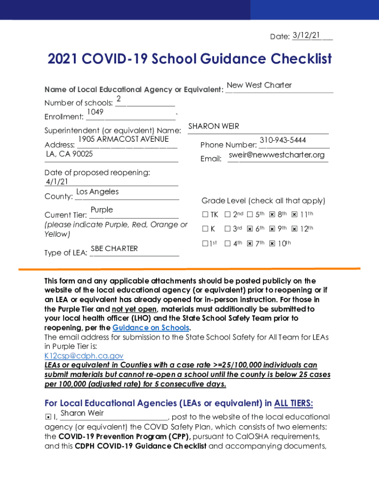 COVID-19 School Guidance Checklist Text January 14, 20213/12/21 Date: ___2021 COVID-19 School Guidance Checklist New West Charter Name of Local Educational Agency or Equivalent: ___ 2 Number of schools: