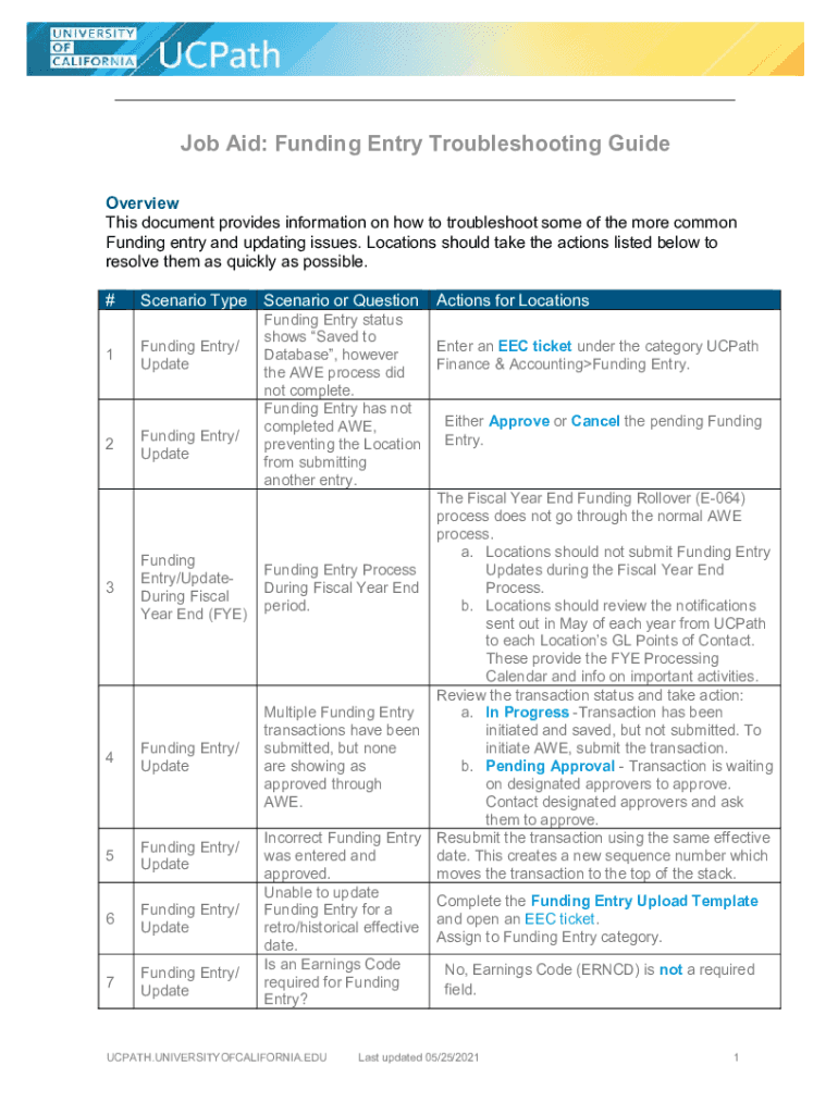 ___ Job Aid: Funding Entry Troubleshooting Guide Overview This document provides information on how to troubleshoot some of the more common Funding entry and updating issues. Locations should take