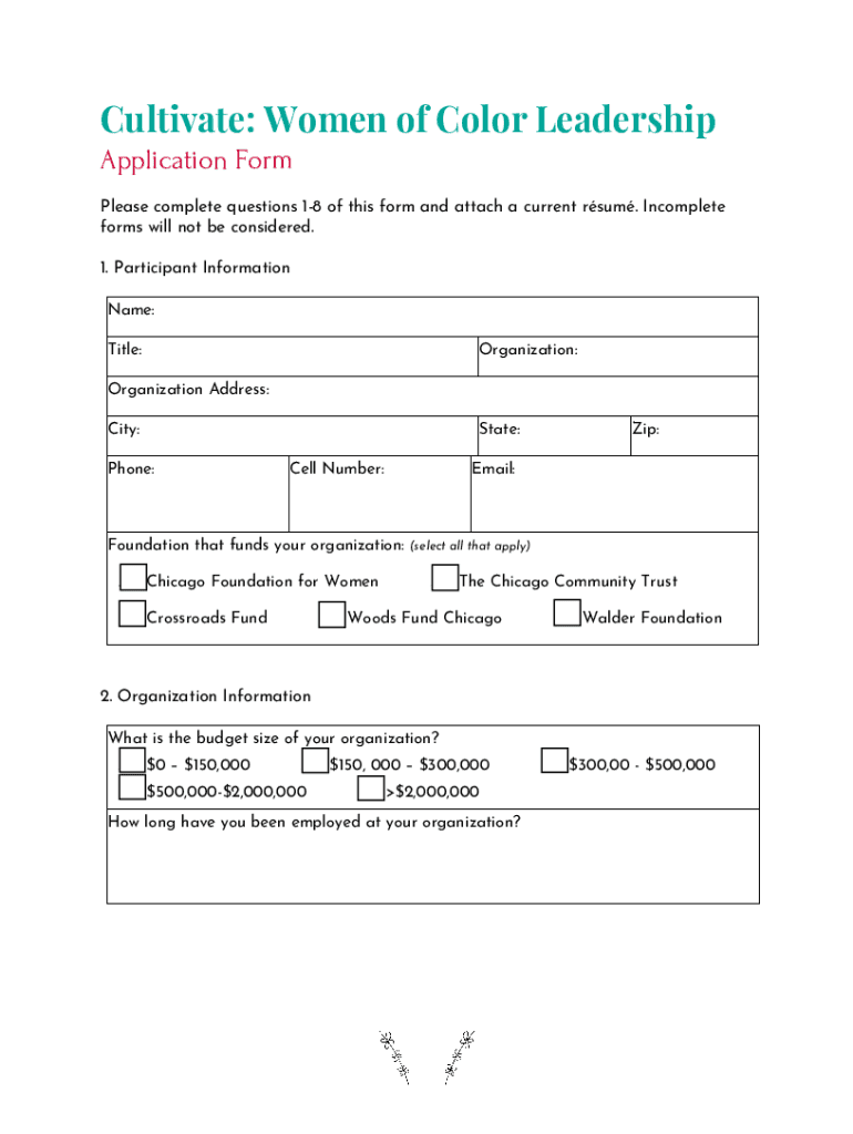 Cultivate: Women of Color Leadership 20202021 Participant Application BackgroundCultivate: Women of Color Leadership (Cultivate) is a joint effort of the Chicago Foundation for Women (CF), Crossroads