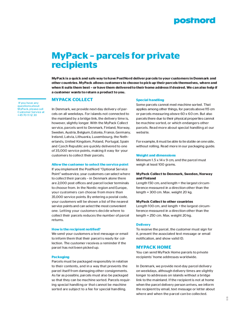 Pack parcels for private recipients Pack is a quick and safe way to have Postcard deliver parcels to your customers in Denmark and other countries. Pack allows customers to choose to pick up their