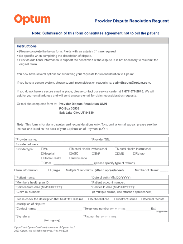 Provider Dispute Resolution Request Note: Submission of this form constitutes agreement not to bill the patient Instructions Please complete the below form. Fields with an asterisk (*) are required.