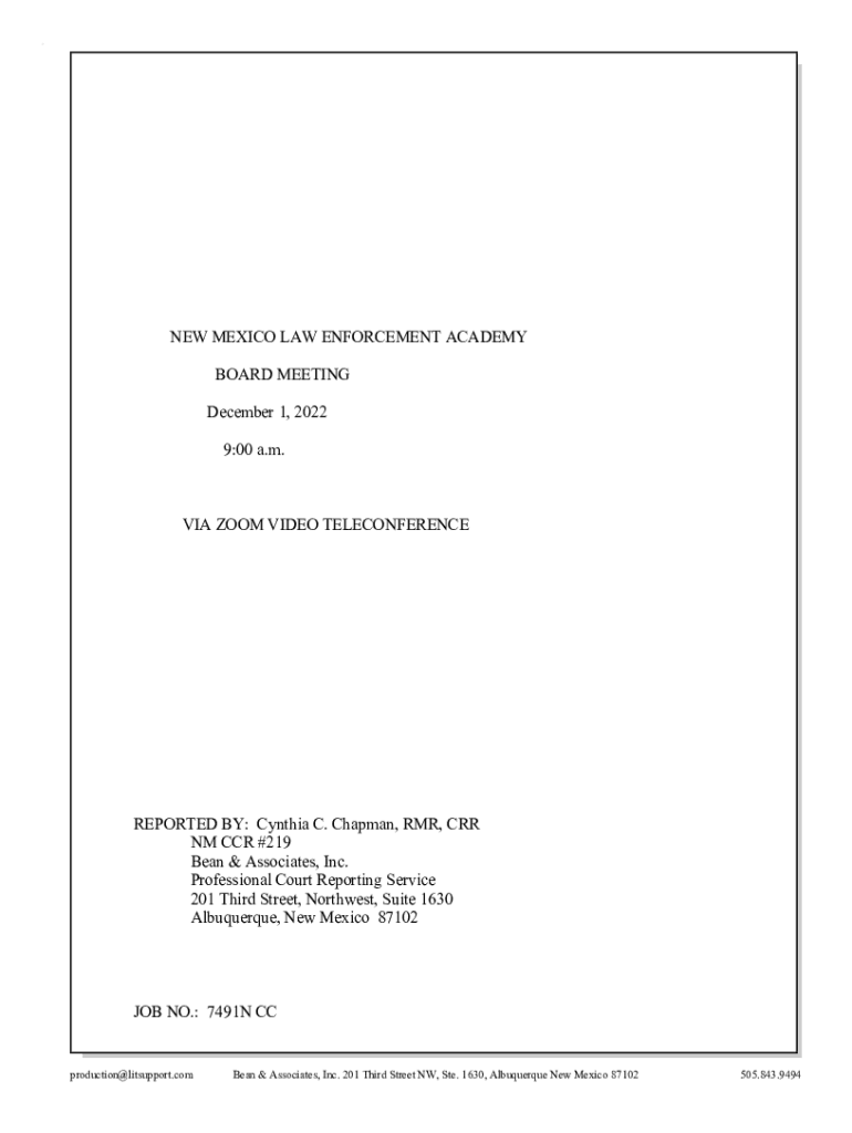 NEW MEXICO LAW ENFORCEMENT ACADEMY BOARD MEETING December 1, 2022 9:00 a.m.VIA ZOOM VIDEO TELECONFERENCEREPORTED BY: Cynthia C. Chapman, MR, CRR NM CCR #219 Bean & Associates, Inc. Professional Court