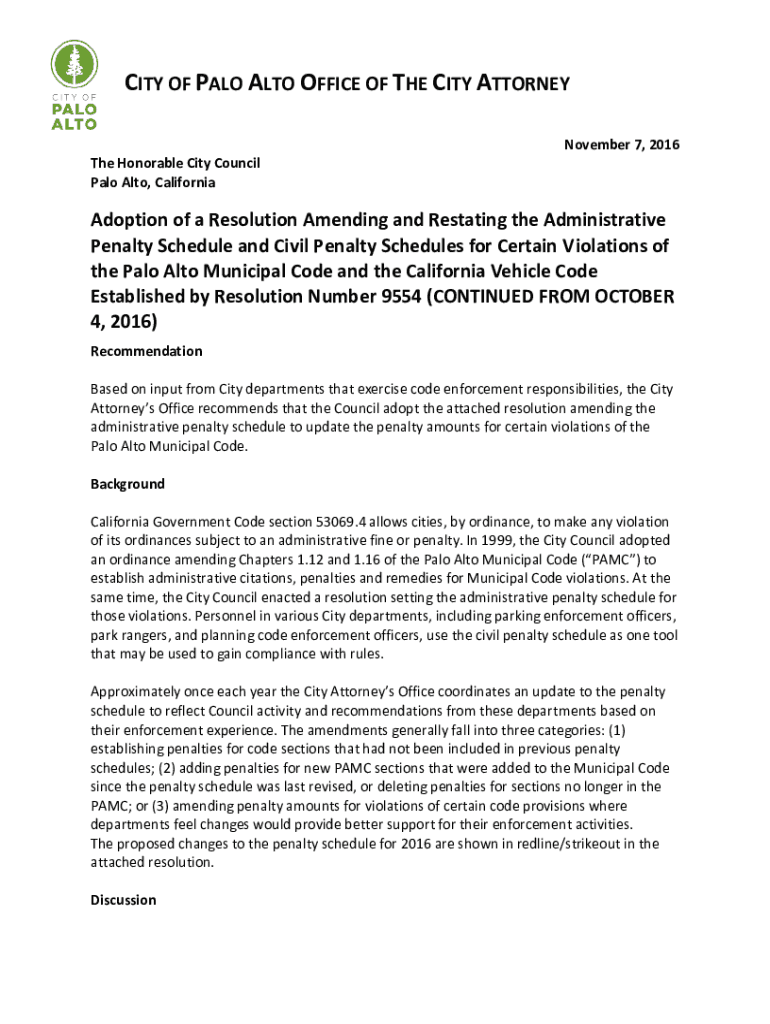 CITY OF PALO ALTO OFFICE OF THE CITY ATTORNEY November 7, 2016, The Honorable City Council Palo Alto, CaliforniaAdoption of a Resolution Amending and Restating the Administrative Penalty Schedule