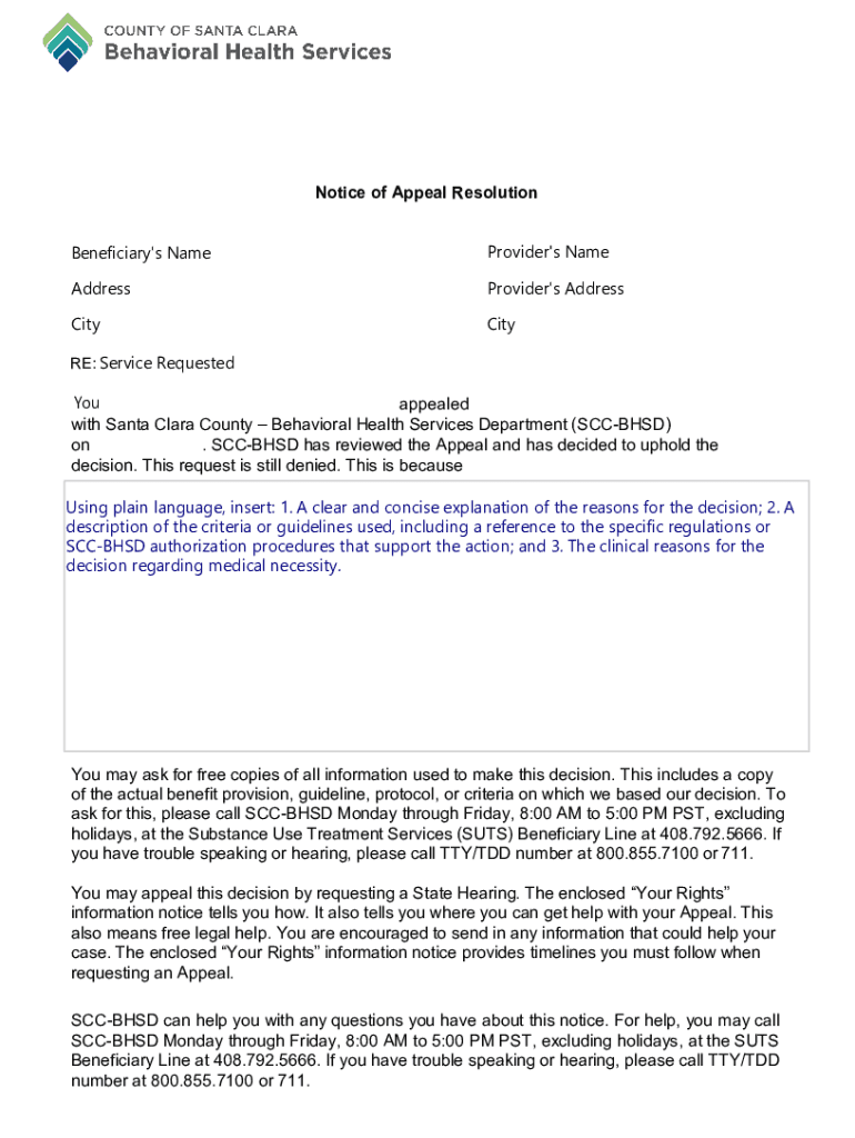 Notice of Appeal Resolution Beneficiary\'s NameProvider\'s NameAddressProvider\'s AddressCityCityRE: Service Requested ___ appealed with Santa Clara County Behavioral Health Services Department (SACHS)
