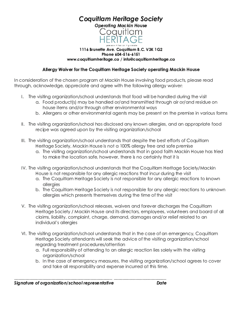 Coquitlam Heritage Society Operating Mac kin House1116 Brunette Ave. Coquitlam B.C. V3K 1G2 Phone 6045166151 www.coquitlamheritage.ca / info@coquitlamheritage.caAllergy Waiver for the Coquitlam Heritage