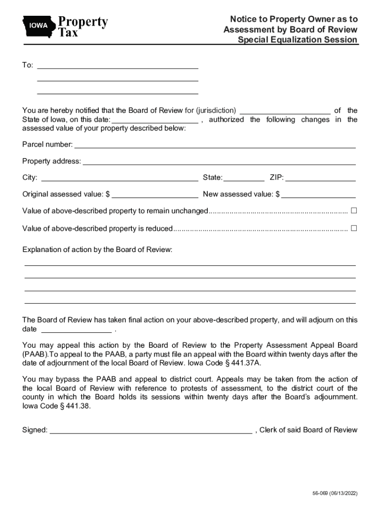 Notice to Property Owner as to Assessment by Board of Review Special Equalization Session To: ___ ___ ___ You are hereby notified that the Board of Review for (jurisdiction) ___ of the State of Iowa,