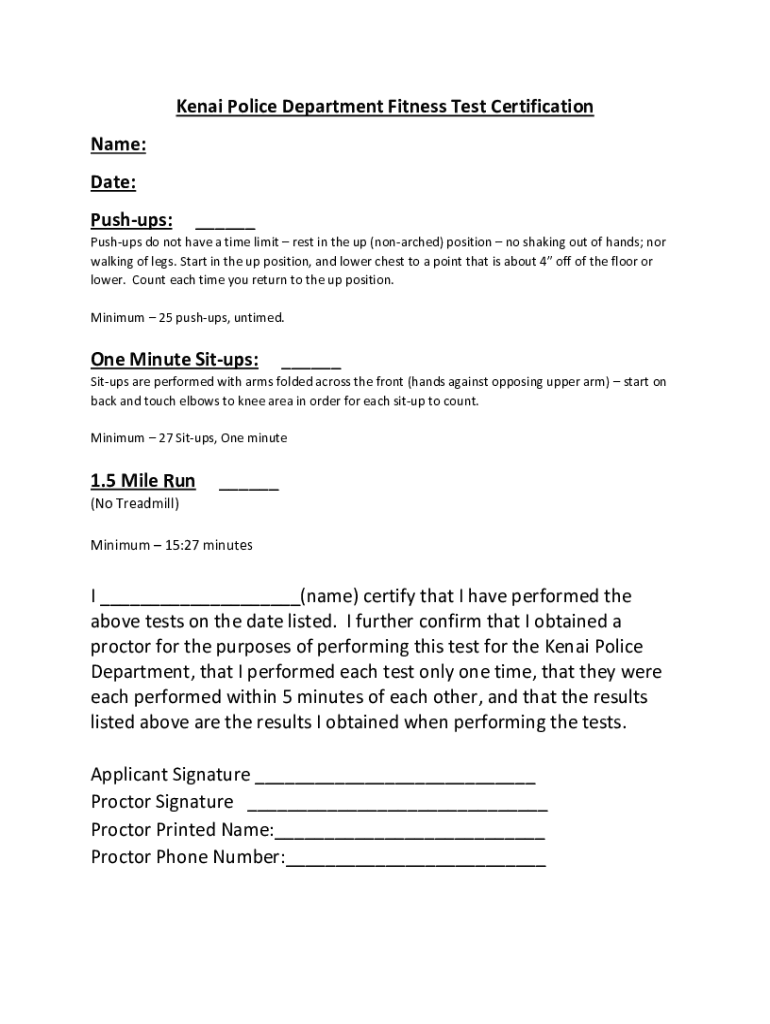 Kenji Police Department Fitness Test Certification Name: Date: Push-ups:___Push-ups do not have a time limit rest in the up (nonarched) position no shaking out of hands; nor walking of legs. Start