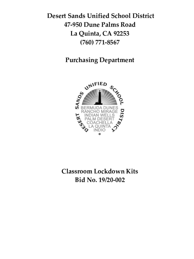 Desert Sands Unified School District 47950 Dune Palms Road La Quinta, CA 92253 (760) 7718567 Purchasing DepartmentClassroom Lockdown Kits Bid No. 19/20002Desert Sands Unified School District 47950