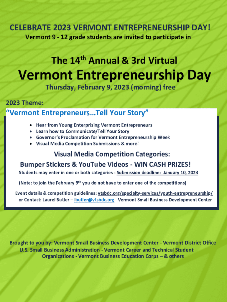 CELEBRATE 2023 VERMONT ENTREPRENEURSHIP DAY! Vermont 9 12 grade students are invited to participate the 14th Annual & 3rd Virtual Vermont Entrepreneurship Day Thursday, February 9, 2023 (morning)