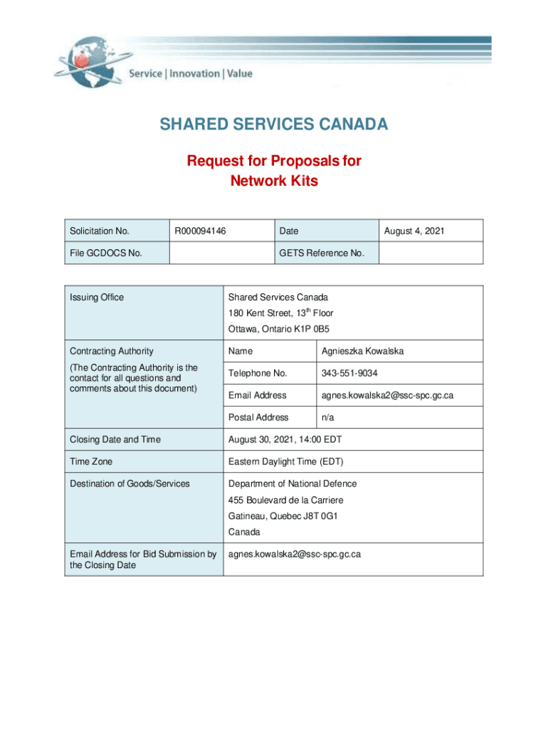 SHARED SERVICES CANADA Request for Proposals for Network KitsSolicitation No. R000094146DateFile DOCS No. Issuing Office August 4, 2021GETS Reference No. Shared Services Canada 180 Kent Street, 13th