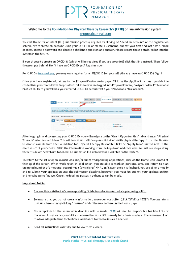 Welcome to the Foundation for Physical Therapy Research (FPR) online submission system!proposalcentral.com To start the letter of intent (LOI) submission process, register by clicking on need an account