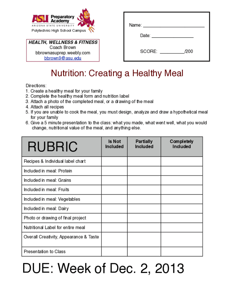 Name: ___ Polytechnic High School Campsite: ___ HEALTH, WELLNESS & FITNESS Coach Brown bbrownasuprep.weebly.com bbrown9@asu.eduSCORE: ___/200Nutrition: Creating a Healthy Meal Directions: 1. Create