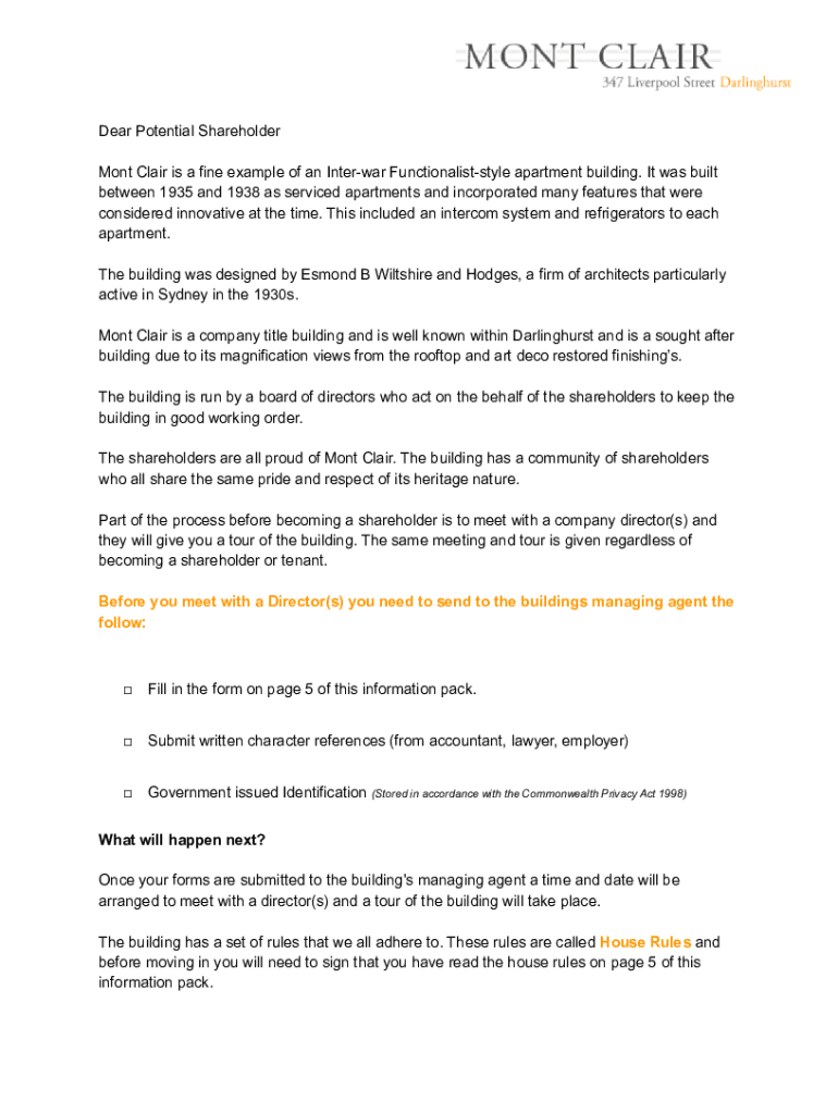 Dear Potential Shareholder Mont Clair is a fine example of an Interwar Functionalist style apartment building. It was built between 1935 and 1938 as serviced apartments and incorporated many features