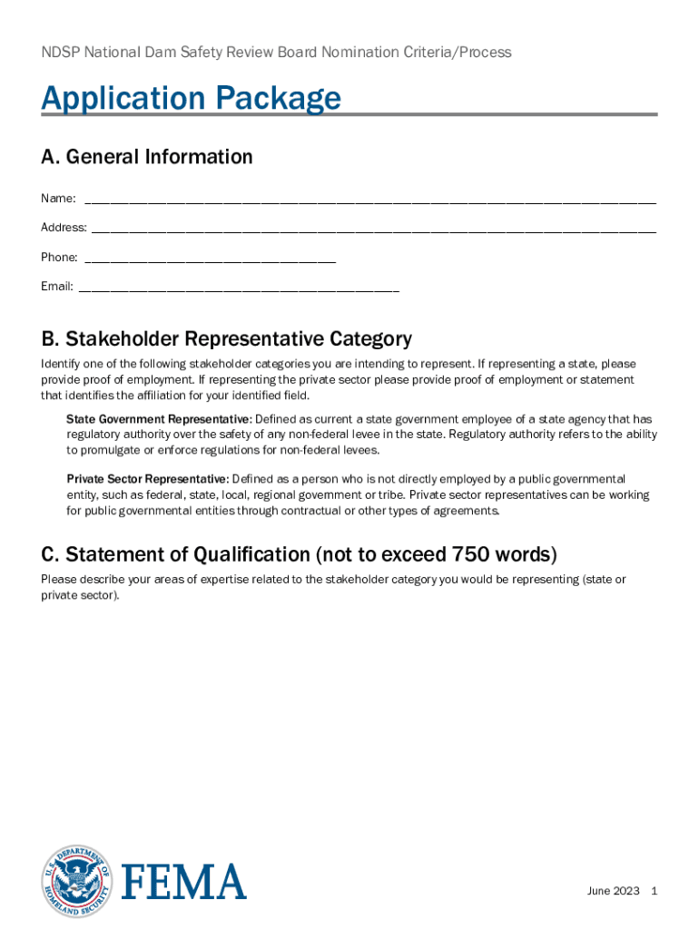 DSP National Dam Safety Review Board Nomination Criteria/ProcessApplication Package A. General Information Name: ___ Address: ___ Phone: ___ Email: ___B. Stakeholder Representative Category Identify
