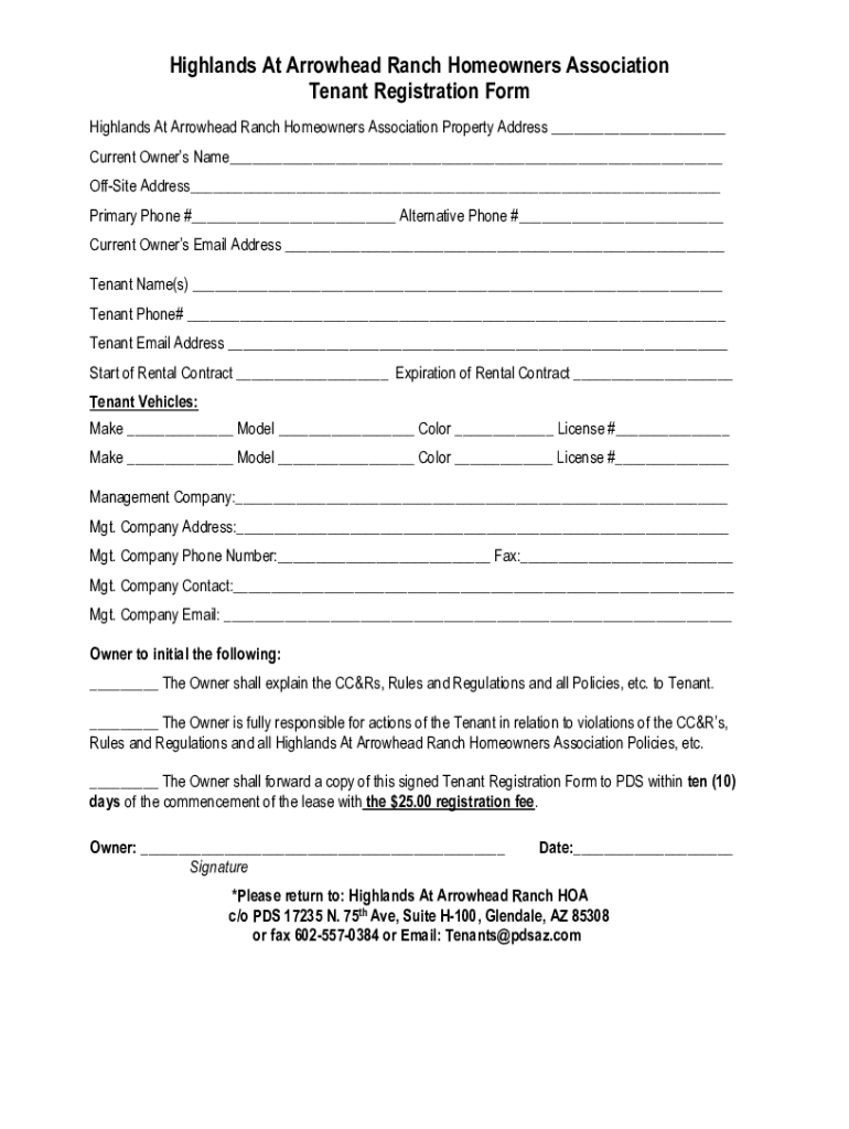 Highlands At Arrowhead Ranch Homeowners Association Tenant Registration Form Highlands At Arrowhead Ranch Homeowners Association Property Address ___ Current Owners Name___ Offsite Address___ Primary