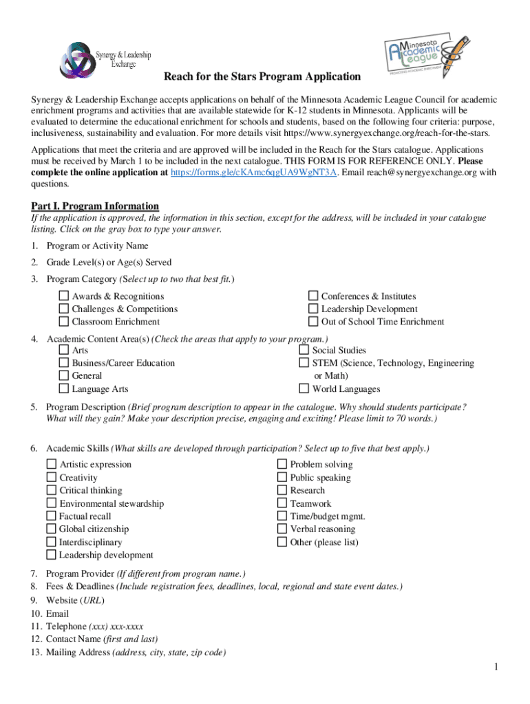 Reach for the Stars Program Application Synergy & Leadership Exchange accepts applications on behalf of the Minnesota Academic League Council for academic enrichment programs and activities that are
