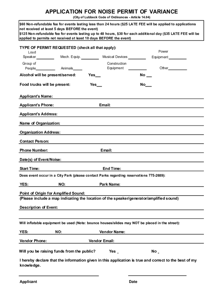 APPLICATION FOR NOISE PERMIT OF VARIANCE (City of Lubbock Code of Ordinances Article 14.04)$60 Nonrefundable fee for events lasting less than 24 hours ($25 LATE FEE will be applied to applications