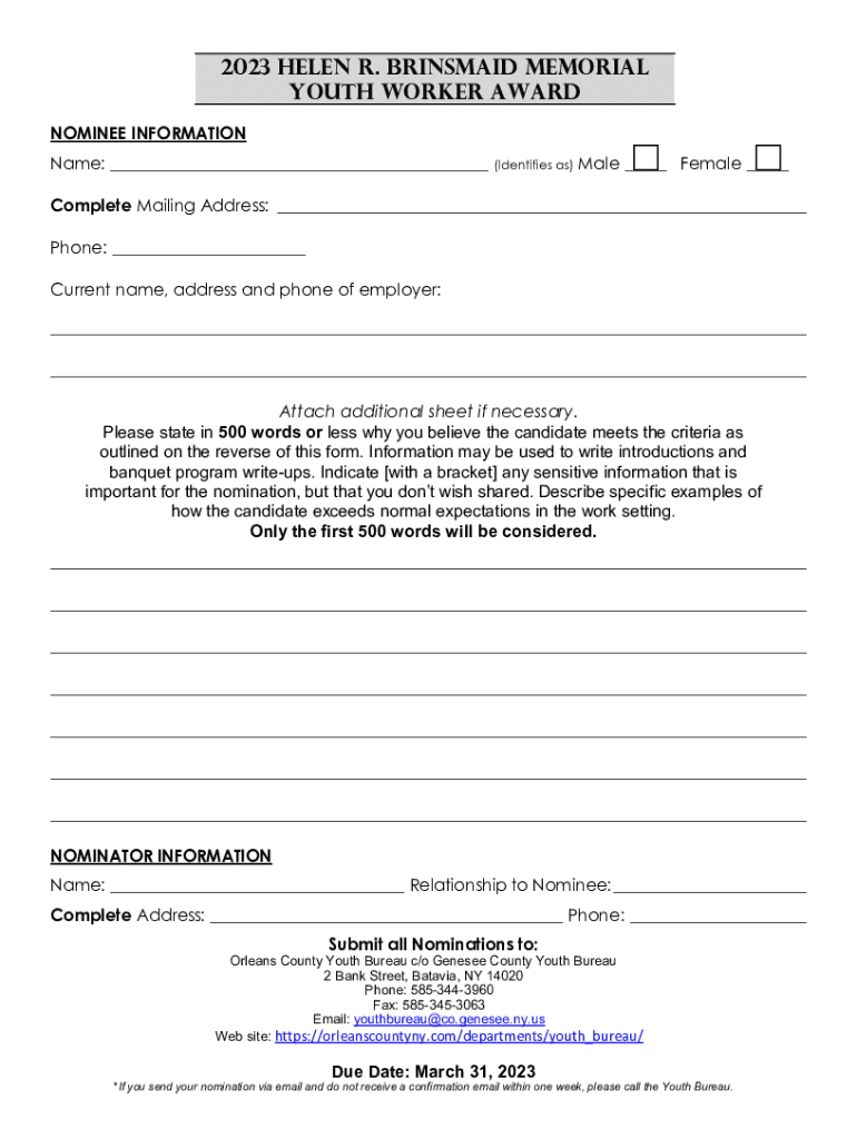 Orleans County Youth Board41st A nnualYouth Recognition Banquet Nomination form for2023 Helen R. Bridesmaid Memorial Youth Worker Award Awarded to a youth serving professional, in a paid position,