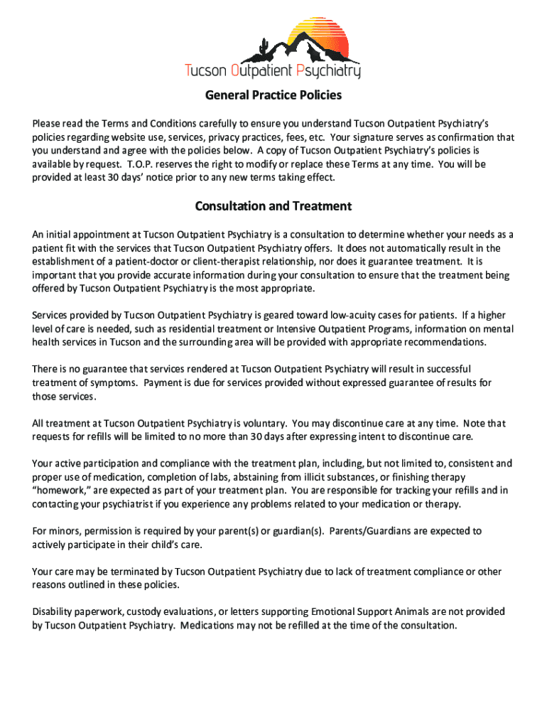 General Practice Policies Please read the Terms and Conditions carefully to ensure you understand Tucson Outpatient Psychiatry policies regarding website use, services, privacy practices, fees, etc.