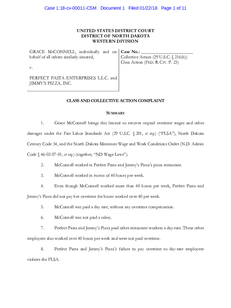 Case 1:18cv00011CSM Document 1 Filed 01/22/18-Page 1 of 11UNITED STATES DISTRICT COURT DISTRICT OF NORTH DAKOTA WESTERN DIVISION GRACE McConnell, individually and on Case No.: ___ behalf of all others