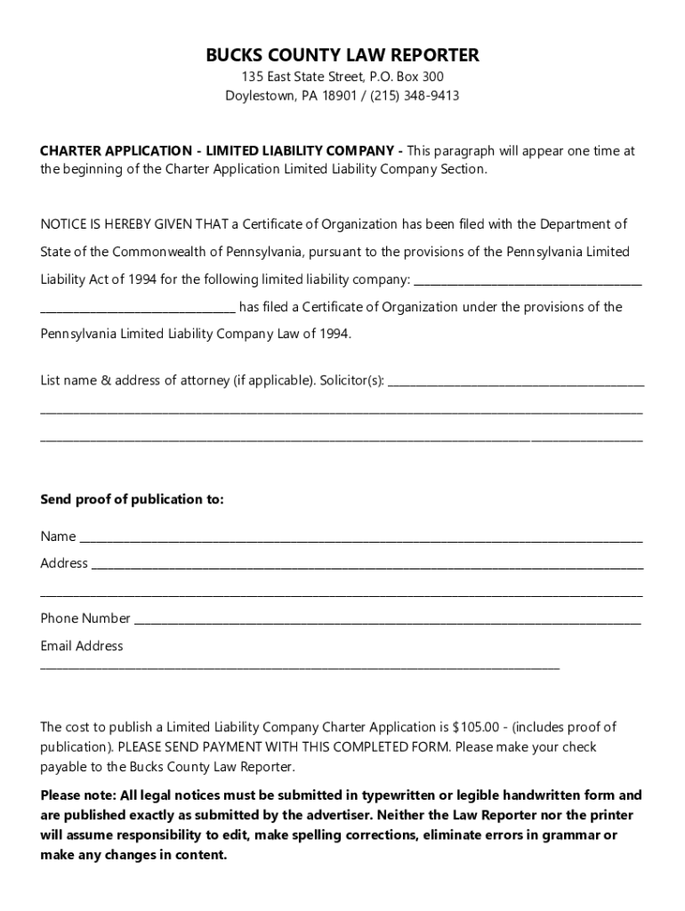 BUCKS COUNTY LAW REPORTER 135 East State Street, P.O. Box 300 Doylestown, PA 18901 / (215) 3489413CHARTER APPLICATION LIMITED LIABILITY COMPANY This paragraph will appear one time at the beginning