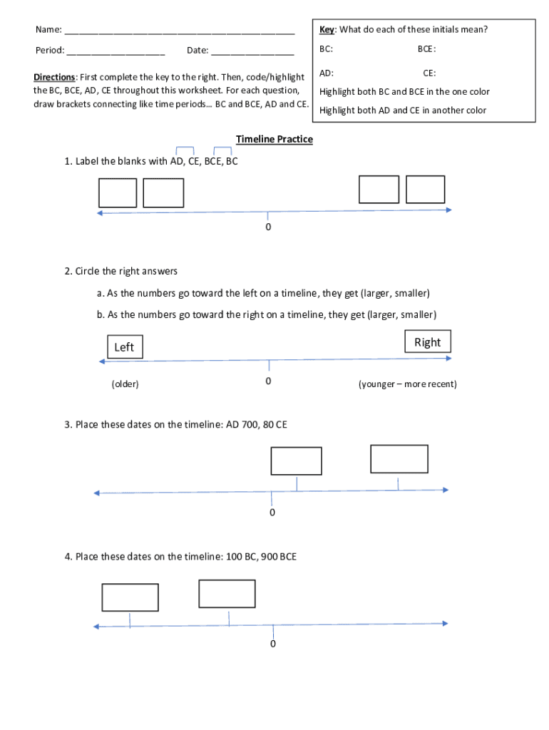 Name: ___Key: What do each of these initials mean? Period: ___BC:BCE:AD:CE:Date: ___Directions: First complete the key to the right. Then, code/highlight the BC, BCE, AD, CE throughout this worksheet.
