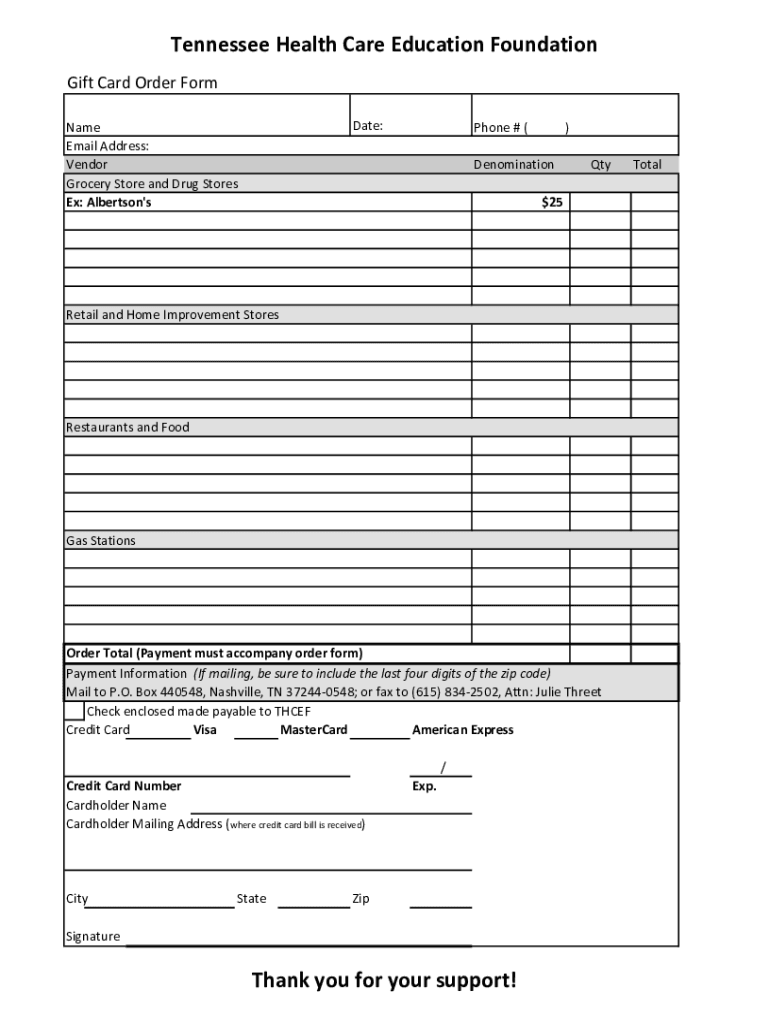 Tennessee Health Care Education Foundation Gift Card Order Form Date:Name Email Address: Vendor Grocery Store and Drug Stores Ex: Albertson\'phone # ()DenominationQty$25Retail and Home Improvement
