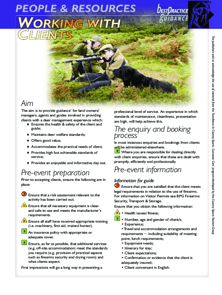 The aim is to provide guidance1 for landowners/ managers, agents and guides involved in providing clients with a deer management experience which: Ensures the health & safety of the client and guide;