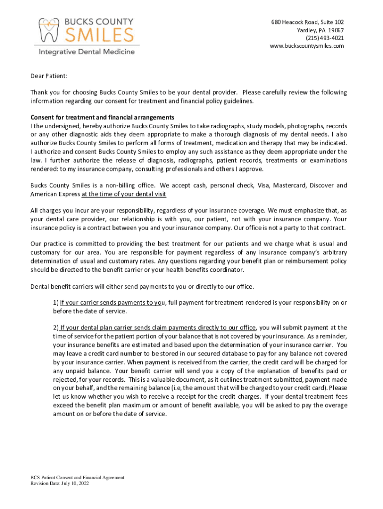 680 Peacock Road, Suite 102 Yardley, PA 19067 (215) 4934021 www.buckscountysmiles.comDear Patient: Thank you for choosing Bucks County Smiles to be your dental provider. Please carefully review the