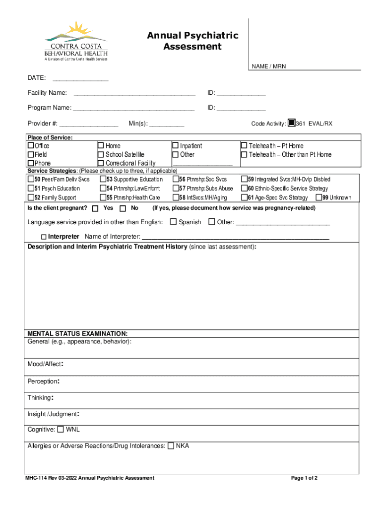 Annual Psychiatric Assessment NAME / MANDATE:___Facility Name:___ID: ___Program Name: ___ID: ___Provider #: ___Min(s): ___Code Activity: 361EVAL/Replace of Service: Office Field Phone Home School