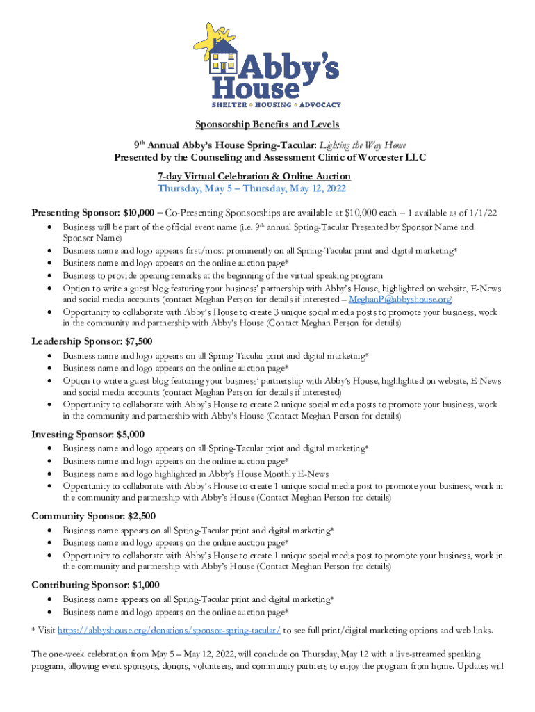 To fill out the sponsor form abbys house, you need to provide information about the event, sponsor details, and any other relevant information requested on the form.
