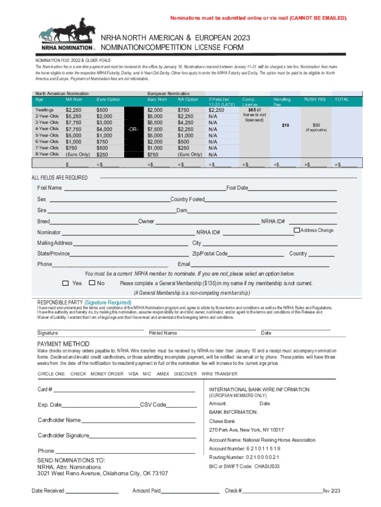 Nominations must be submitted online or via mail (CANNOT BE EMAILED).NRA NORTH AMERICAN & EUROPEAN 2023 NOMINATION/COMPETITION LICENSE FORM NOMINATION FEES 2022 & OLDER FOALS The Nomination fee is
