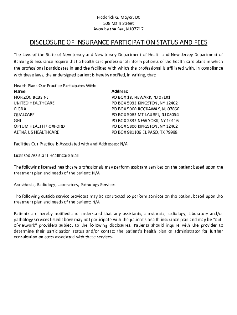 Frederick G. Mayer, DC 508 Main Street Avon by the Sea, NJ 07717DISCLOSURE OF INSURANCE PARTICIPATION STATUS AND FEES The laws of the State of New Jersey and New Jersey Department of Health and New