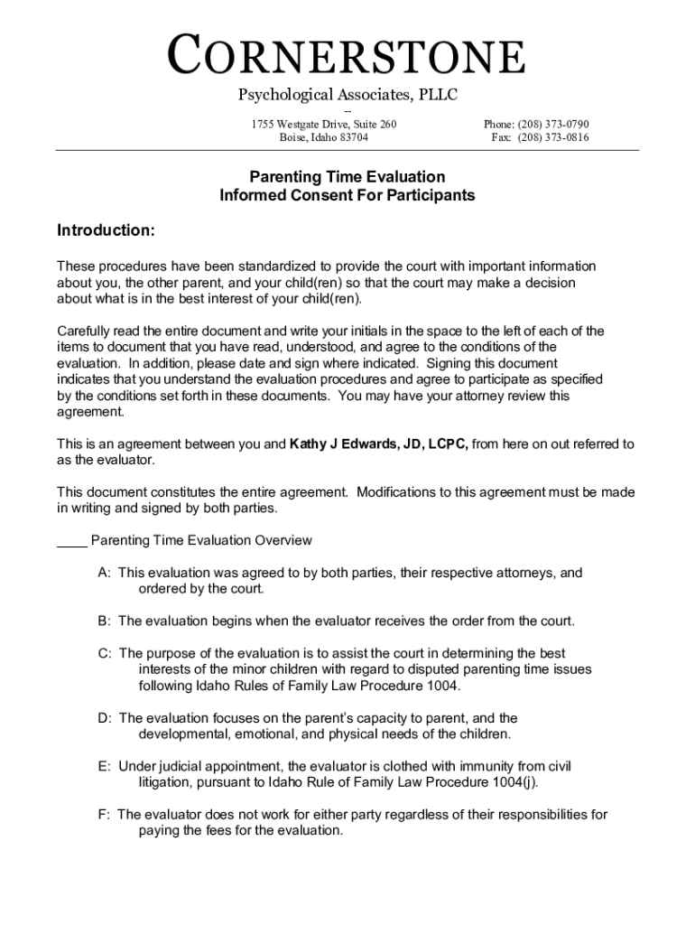 C CORNERSTONE Psychological Associates, LLC 1755 West gate Drive, Suite 260 Boise, Idaho 83704Phone: (208) 3730790 Fax: (208) 3730816Parenting Time Evaluation Informed Consent For Participants Introduction: