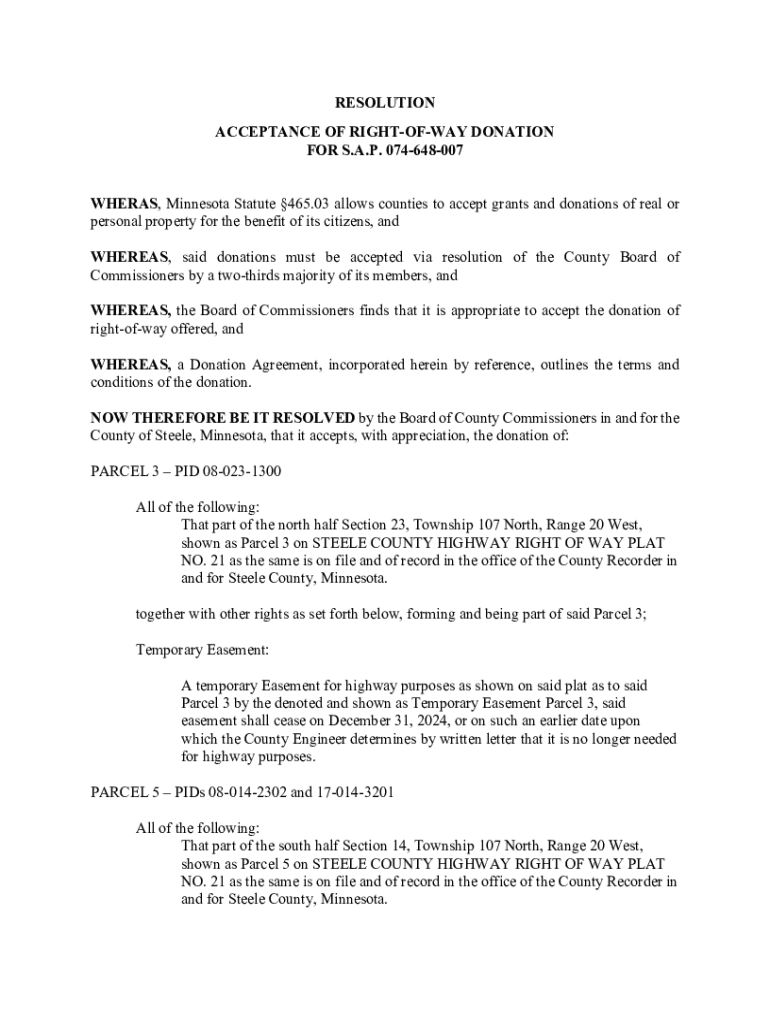 RESOLUTION ACCEPTANCE OF RIGHTOFWAY DONATION FOR S.A.P. 074648007 WHEREAS, Minnesota Statute 465.03 allows counties to accept grants and donations of real or personal property for the benefit of its