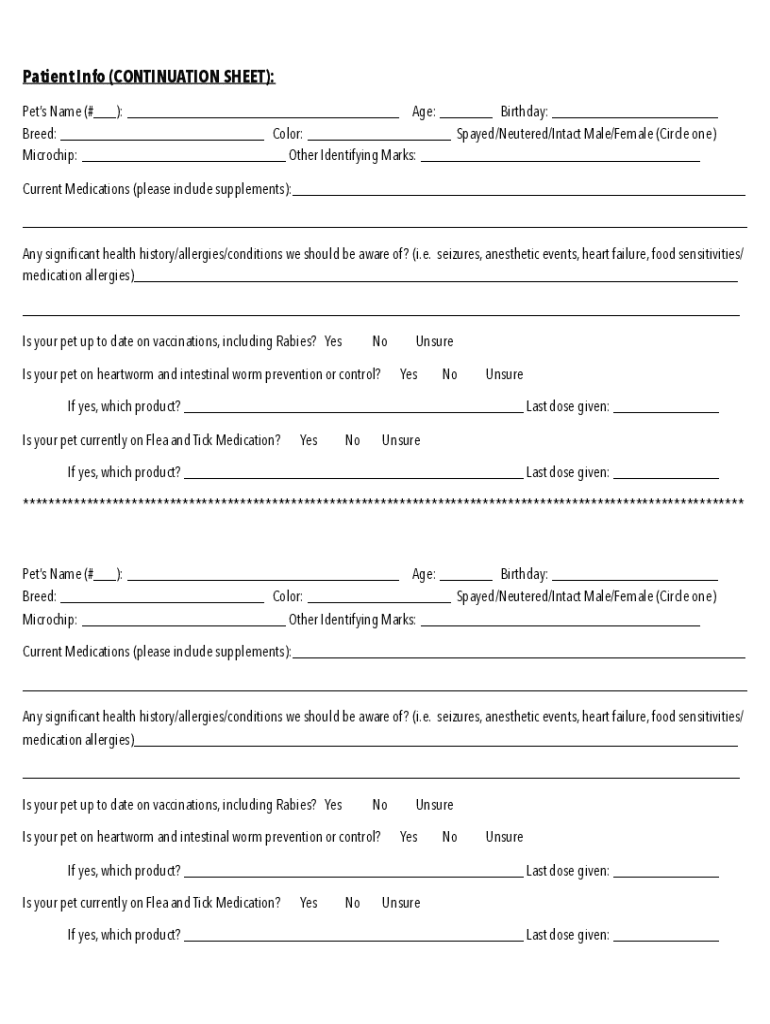Patient Info (CONTINUATION SHEET): Pets Name (#___): ___ Age: ___ Birthday: ___ Breed: ___ Color: ___ Spayed/Neutered/Intact Male/Female (Circle one) Microchip: ___ Other Identifying Marks: ___ Current