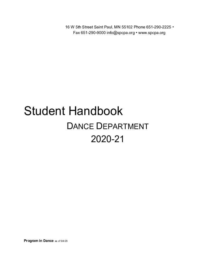 16 W 5th Street Saint Paul, MN 55102 Phone 6512902225 Fax 6512909000 info@spcpa.org www.spcpa.orgStudent Handbook DANCE DE APARTMENT 202021Program in Dance as of 9/4/20Dance Department Student Handbook