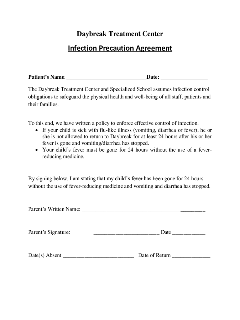 Daybreak Treatment CenterInfection Precaution AgreementPatients Name: ___Date: ___