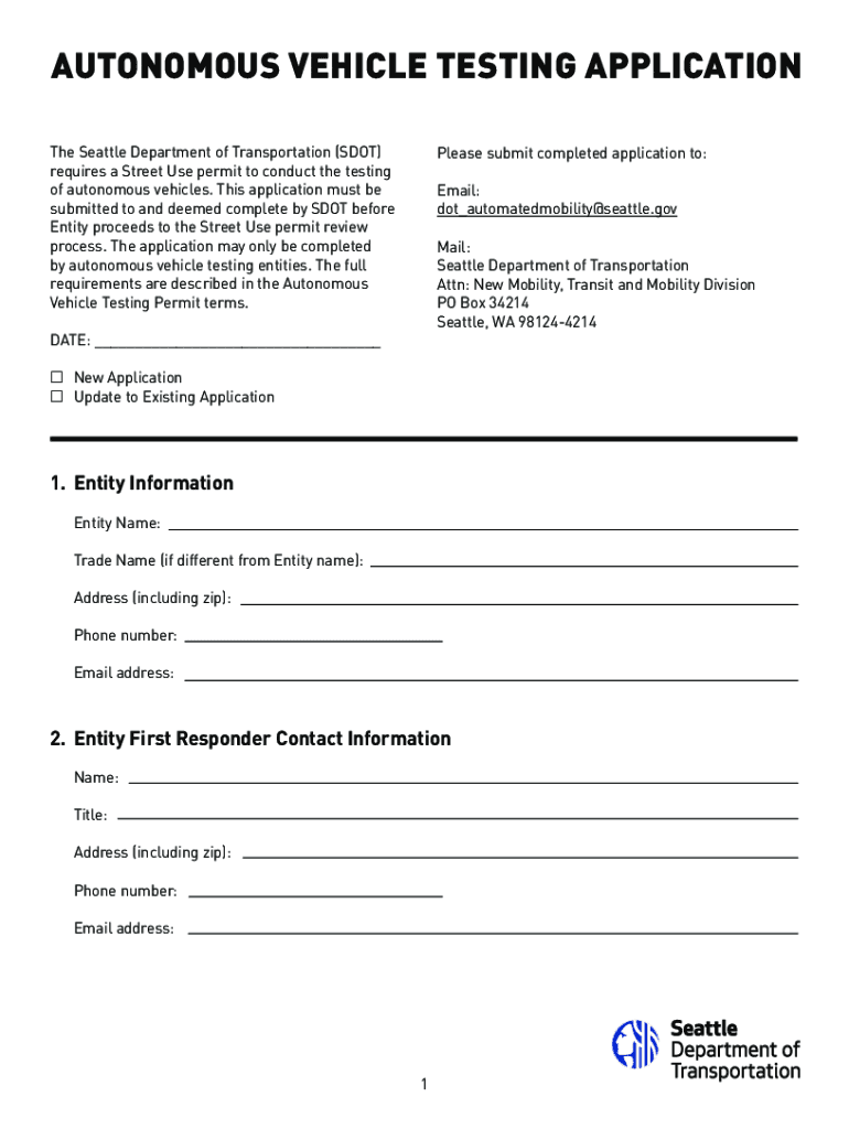 AUTONOMOUS VEHICLE TESTING APPLICATION The Seattle Department of Transportation (SHOT) requires a Street Use permit to conduct the testing of autonomous vehicles. This application must be submitted