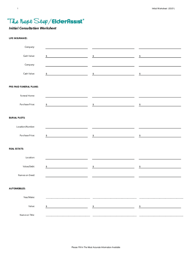 1Initial Worksheet (03/21)Initial Consultation Worksheet LIFE INSURANCE:Company:Cash Value:$$$$$$$$$$$$$$$_________$$$_________Company:Cash Value:PREPAID FUNERAL PLANS:Funeral Home:Purchase Price:BURIAL