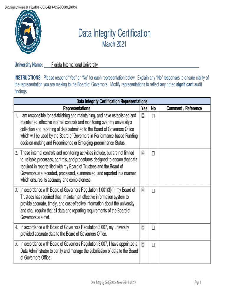 DocuSign Envelope ID: F6EA198FDC3E42F4A259CCC49E289A56Data Integrity Certification March 2021 University Name: ___Florida International University___ INSTRUCTIONS: Please respond Yes or No for each
