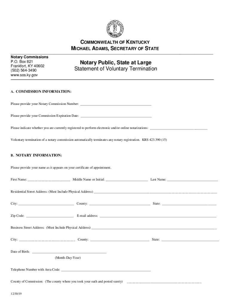 COMMONWEALTH OF KENTUCKY MICHAEL ADAMS, SECRETARY OF STATE ___Notary Commissions P.O. Box 821 Frankfort, KY 40602 (502) 5643490 www.sos.ky.govNotary Public, State at Large Statement of Voluntary Termination(Limited