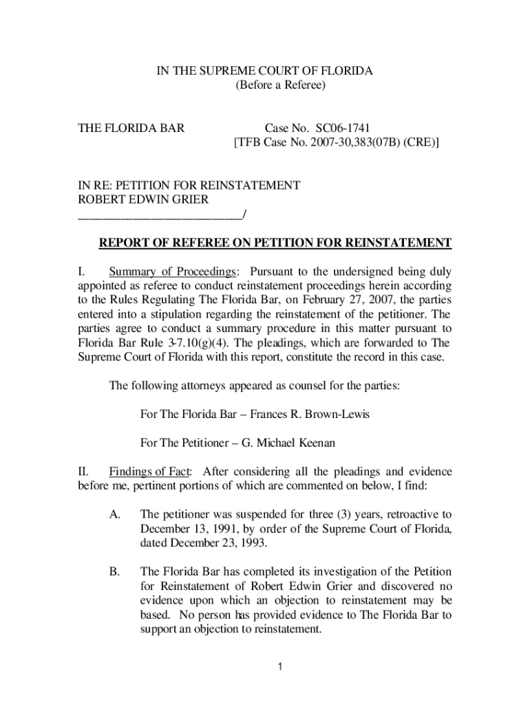 IN THE SUPREME COURT OF FLORIDA (Before a Referee)THE FLORIDA BAR Case No. SC061741 [TFB Case No. 200730,383(07B) (CRE)]IN RE: PETITION FOR REINSTATEMENT ROBERT EDWIN GRIEF ___/ REPORT OF REFEREE