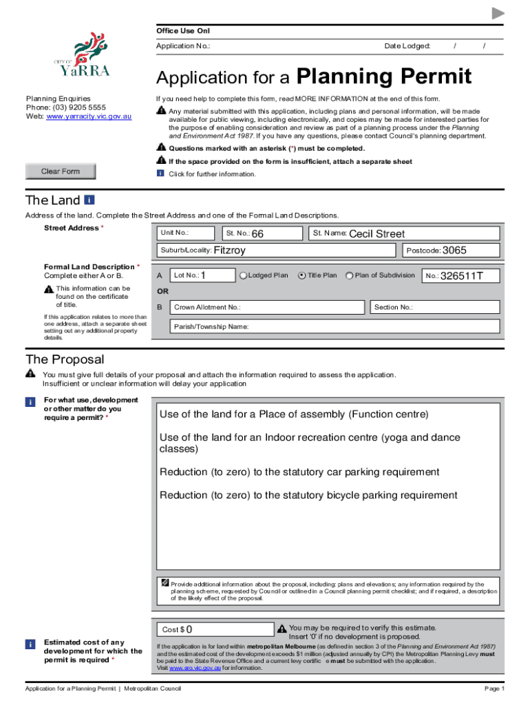 Office Use On Application No.:Date Lodged:Application for a Planning Inquiries Phone: (03) 9205 5555 Web: www.yarracity.vic.gov.au//PermitIf you need help to complete this form, read MORE INFORMATION