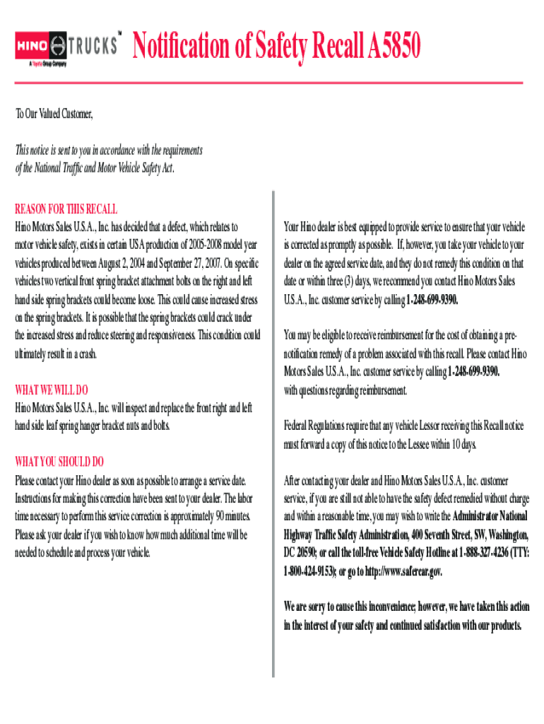 Notification of Safety Recall A5850 To Our Valued Customer, This notice is sent to you in accordance with the requirements of the National Traffic and Motor Vehicle Safety Act. REASON FOR THIS RECALL