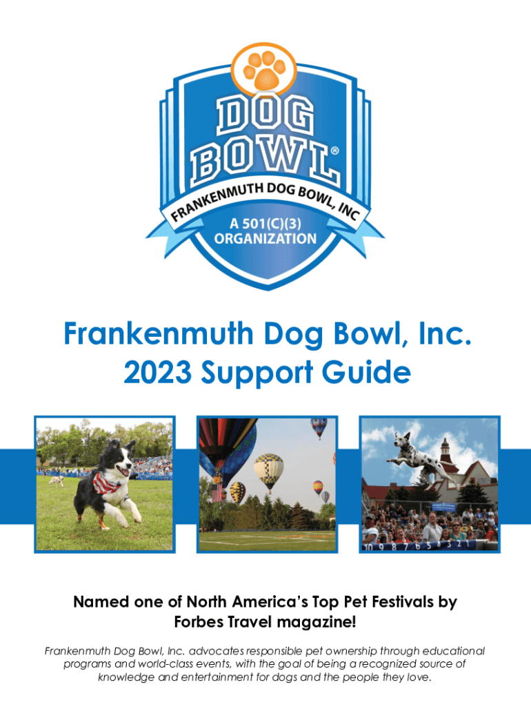 Frankenmuth Dog Bowl, Inc. 2023 Support GuideNamed one of North Americas Top Pet Festivals by Forbes Travel magazine! Frankenmuth Dog Bowl, Inc. advocates responsible pet ownership through educational